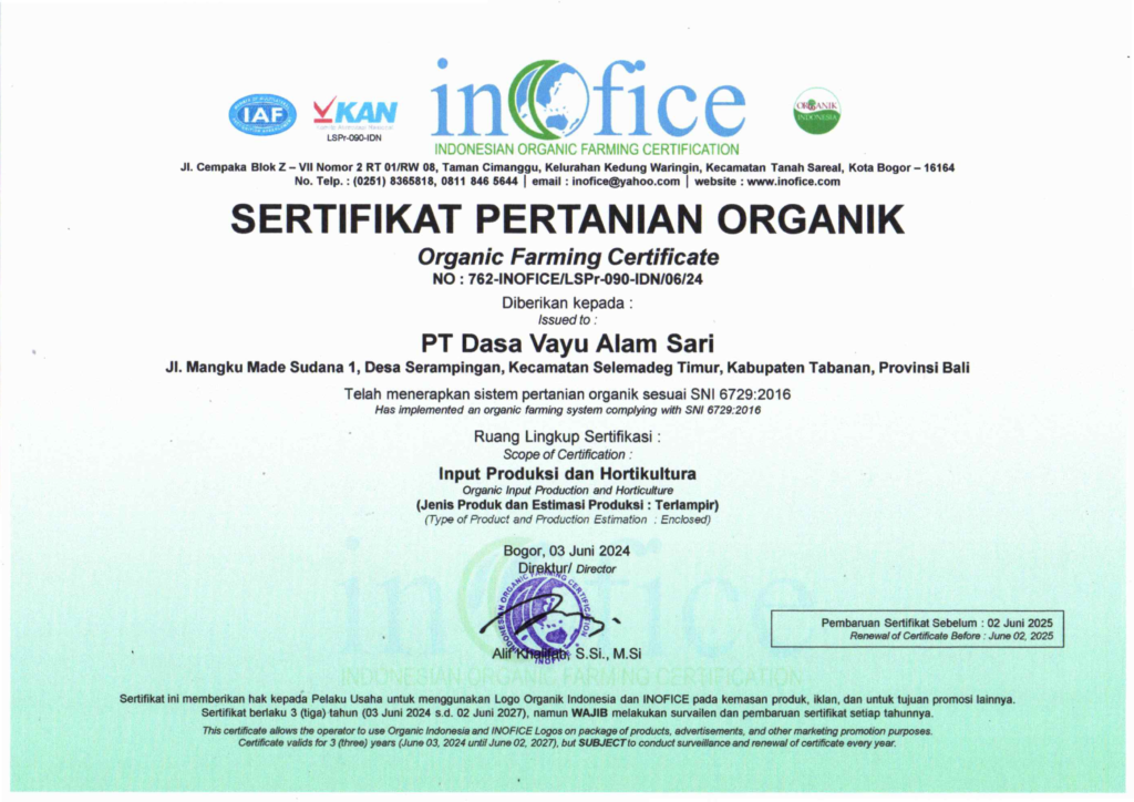 Sertifikat Pertanian Organik PT. Dasa Vayu Alam Sari